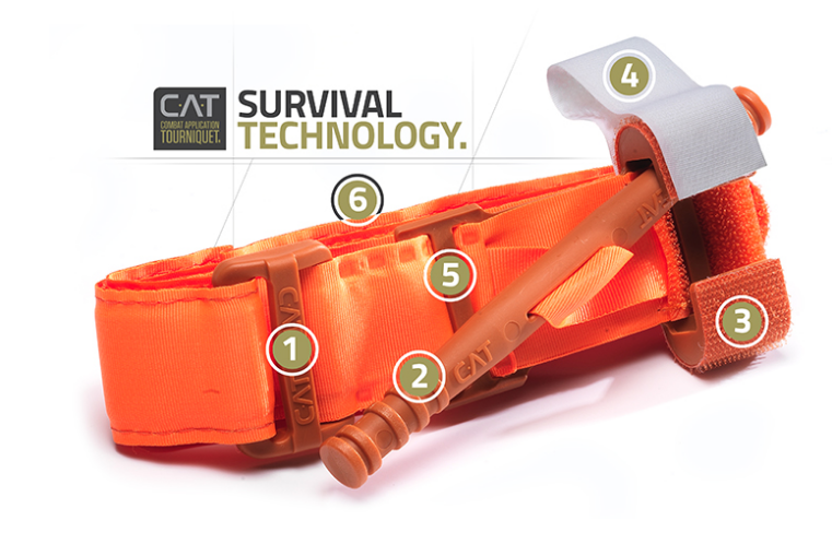 The Combat Application Tourniquet® is a small, light-weight, one-handed tourniquet that stops arterial blood flow in an arm or a leg. The C.A.T uses a windlass system with a patented free-moving internal band. This provides true circumferential pressure to the extremity. Once adequately tightened, bleeding will stop and the windlass is locked into place. A hook and loop windlass retention strap is then applied. This secures the windlass to maintain pressure while emergency services arrive. The C.A.T's dual securing system avoids the use of screws and clips which can become difficult to operate under when under stress or where fine motor skills are compromised.